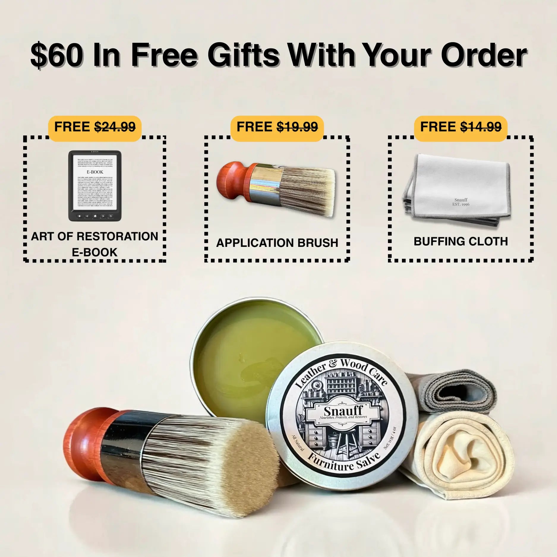 I used Snauff Furniture Salve together with the Snauff cleaning kit as prep, and the results were excellent. I first cleaned the surface with the kit, let it dry fully, and then applied a light layer of the salve with a buffing cloth. On leather I worked in small circles with light pressure. On wood I followed the grain and buffed to a natural glow.