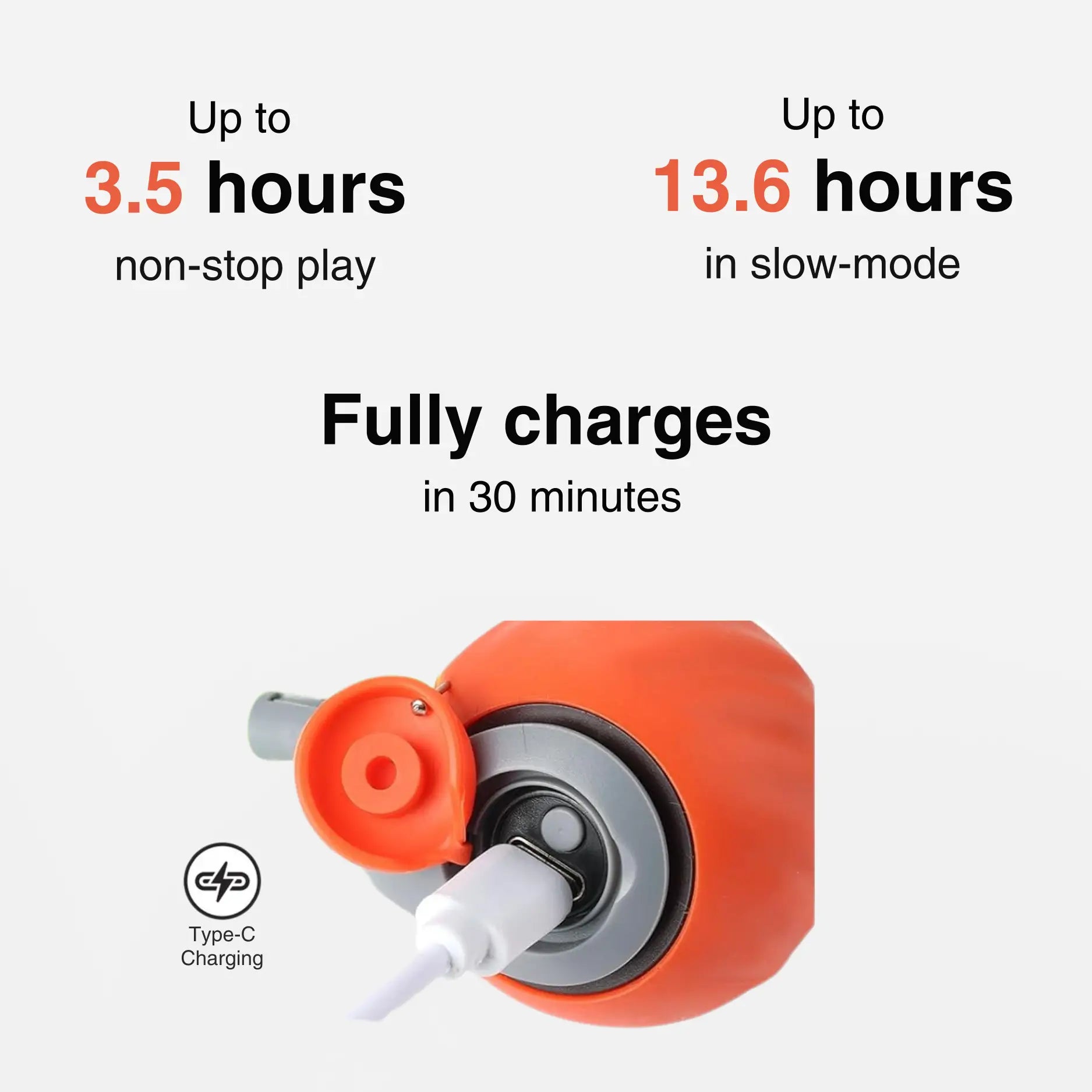 No one gets excited about battery specs but you’ll love what they mean. TumbleTail™ runs for hours of nonstop fun, then recharges in just 30 minutes with the included USB-C cable. No fuss. Just more play, less waiting.