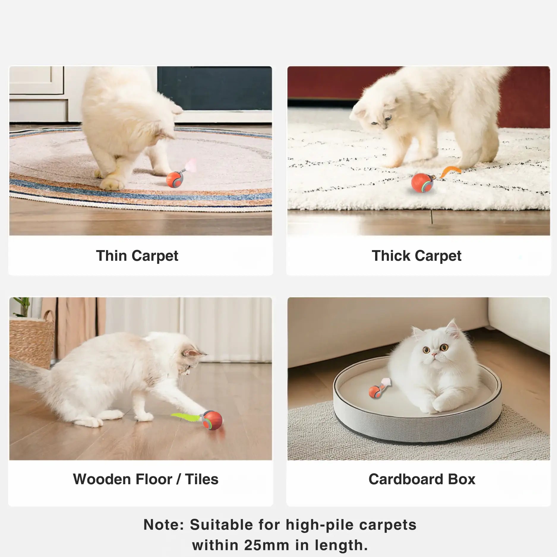 Engineered with robust power, our toy works effortlessly on various surfaces whether it's hard floors, low-pile carpets, or even thick rugs, ensuring playtime anytime, anywhere.