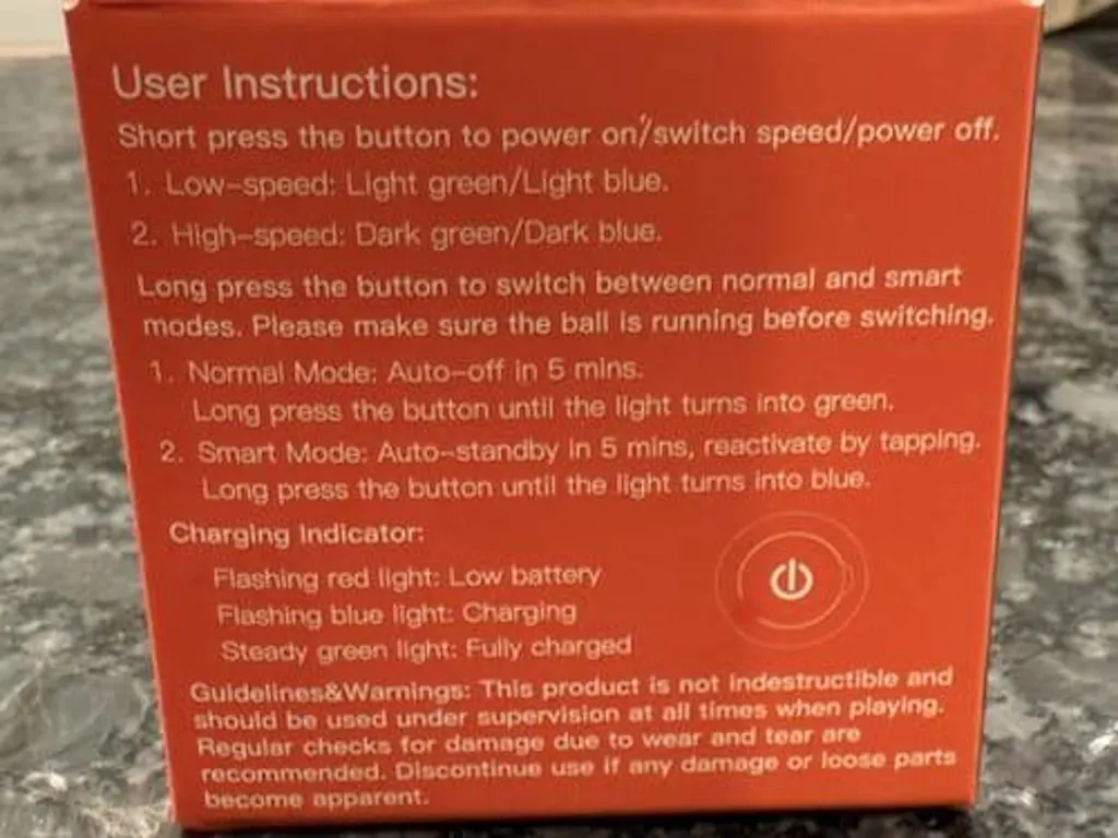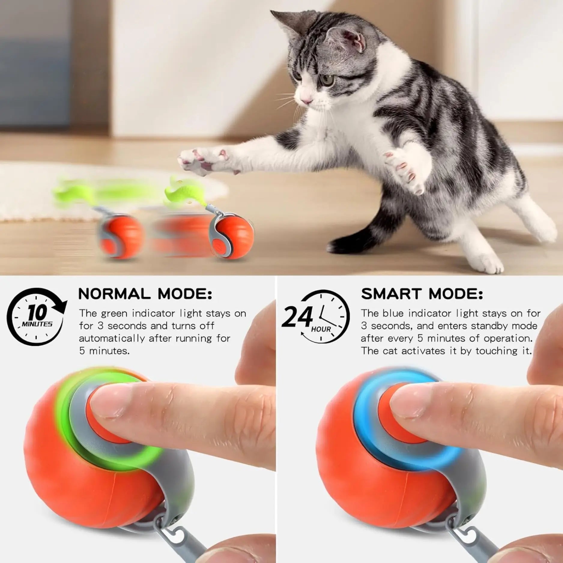 Remove loose hair and wipe the surface with a damp cloth. Hold the button to power on. Tap to switch modes: Slow for gentle play, Fast for active cats, and Standby to pause until your cat reactivates it with a touch.
